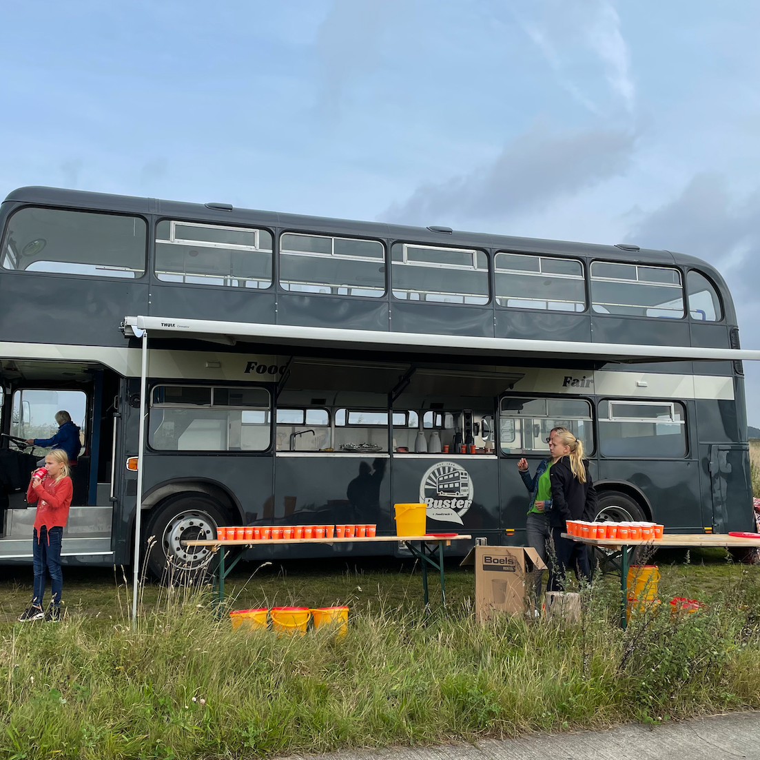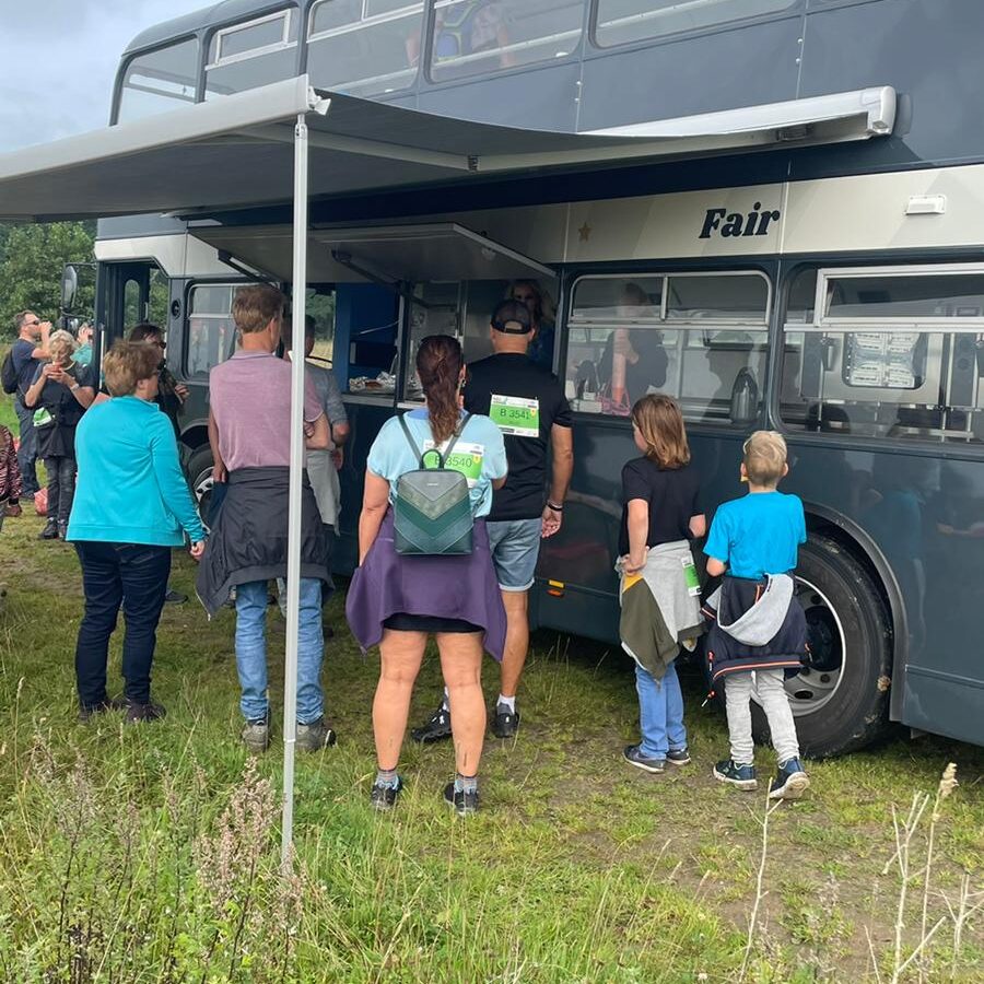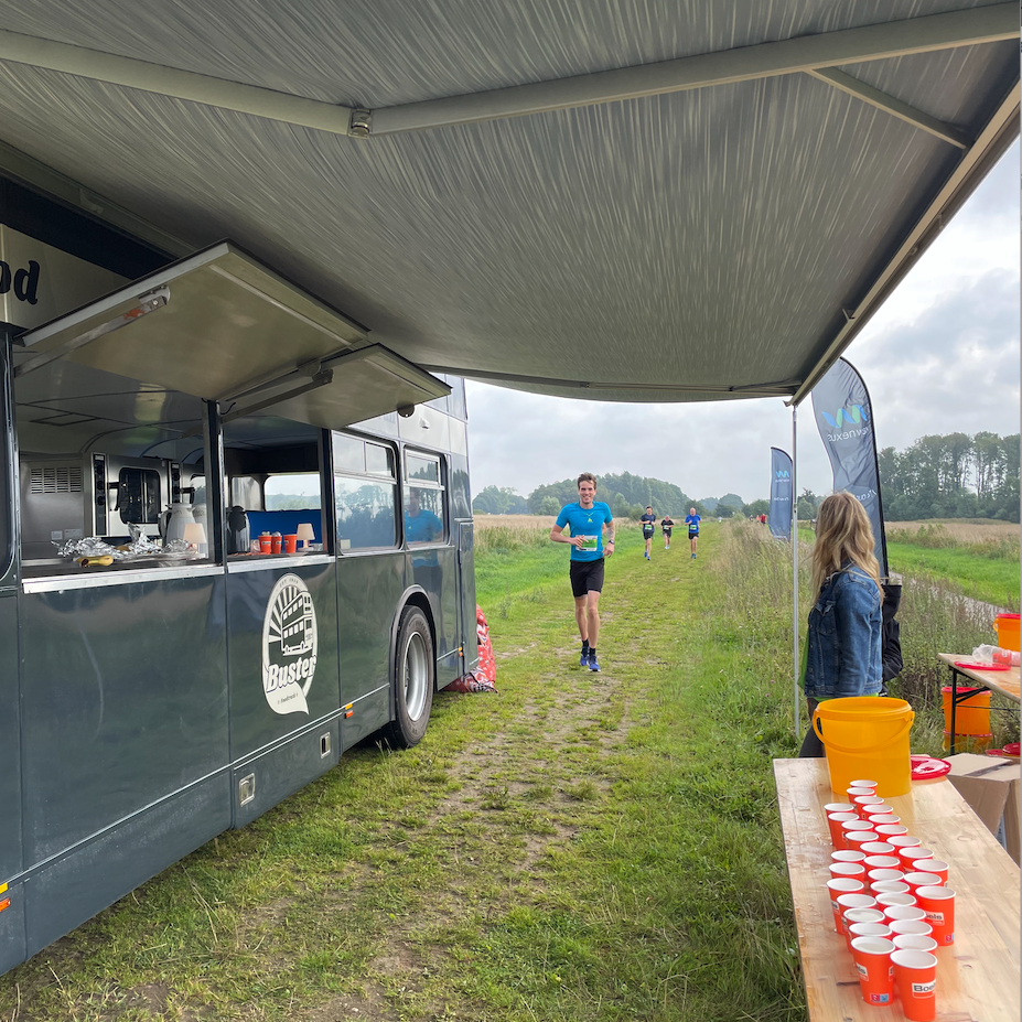 Na 2,5 jaar sleutelen maakte afgelopen zondag onze foodtruck Buster zijn debuut tijdens de Groene 4 Mijl in natuurgebied De Onlanden. De Engelse dubbeldekker fungeerde halverwege het parcours als waterpunt voor lopers en wandelaars.