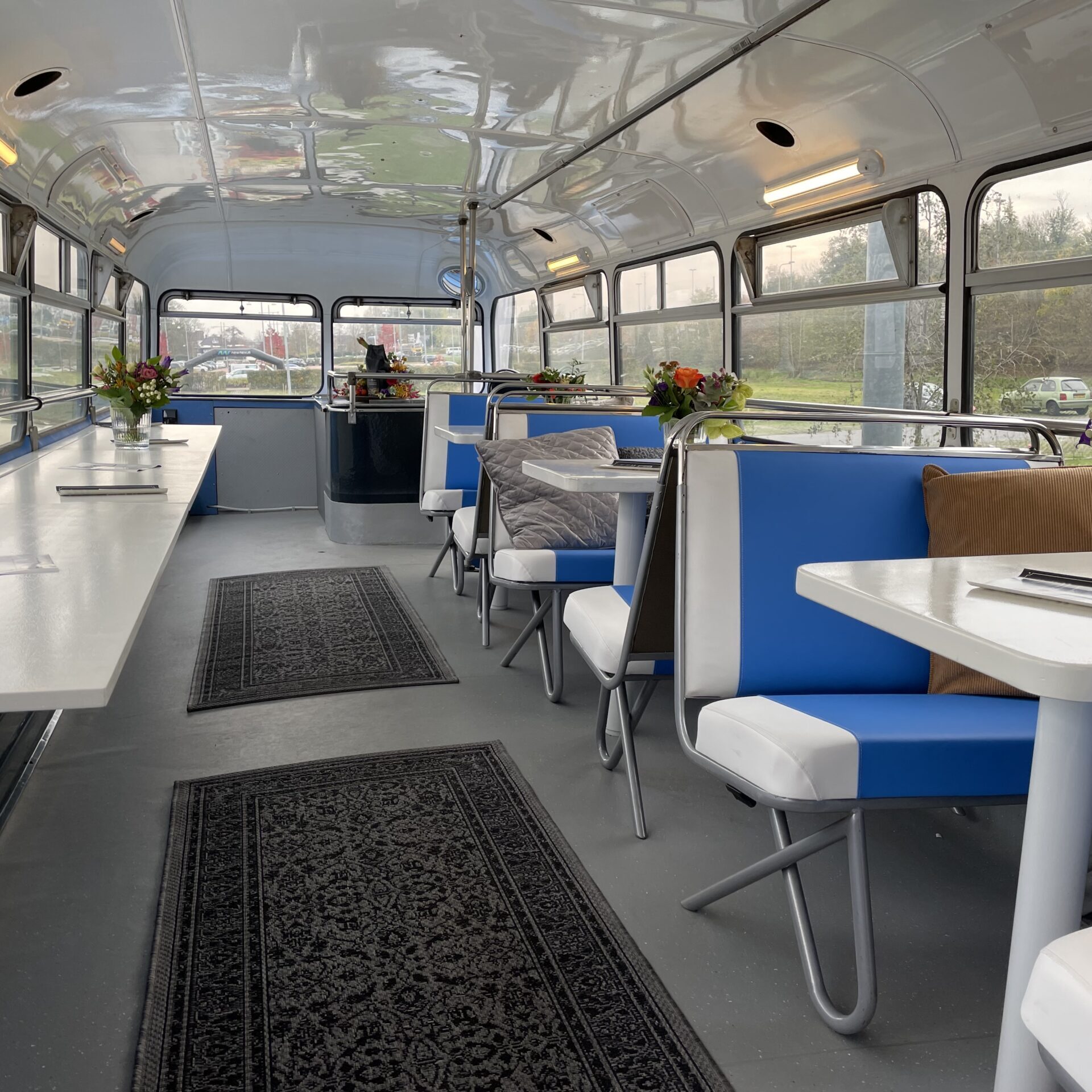 Het oude en Engelse karakter hebben we geprobeerd zoveel mogelijk in ere te houden met de retro look and feel, zowel van buiten als binnen. Boven in de bus is ruimte voor 22 zitplekken om van het eten te genieten of een bijeenkomst te houden. De foodtruck is te huur voor bijvoorbeeld festivals maar ook zakelijke evenementen.