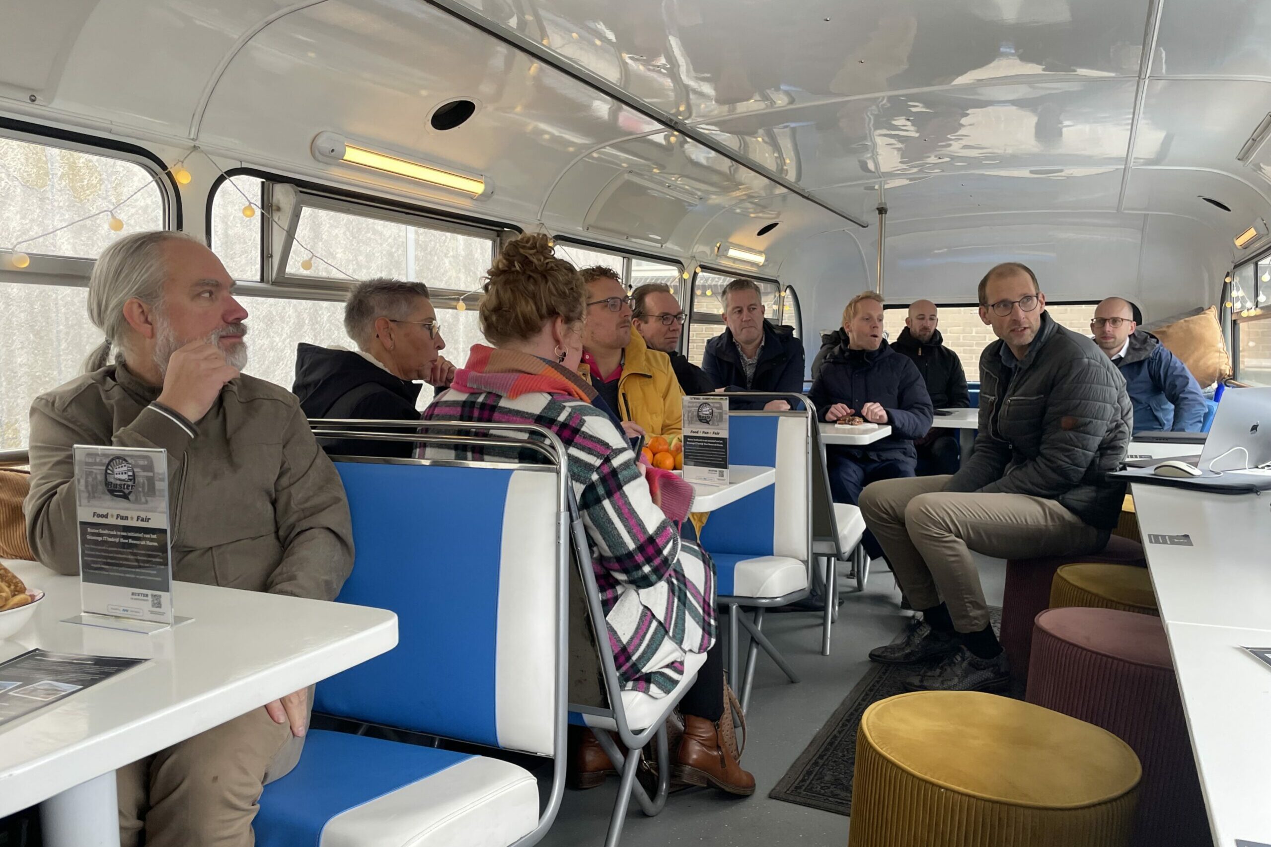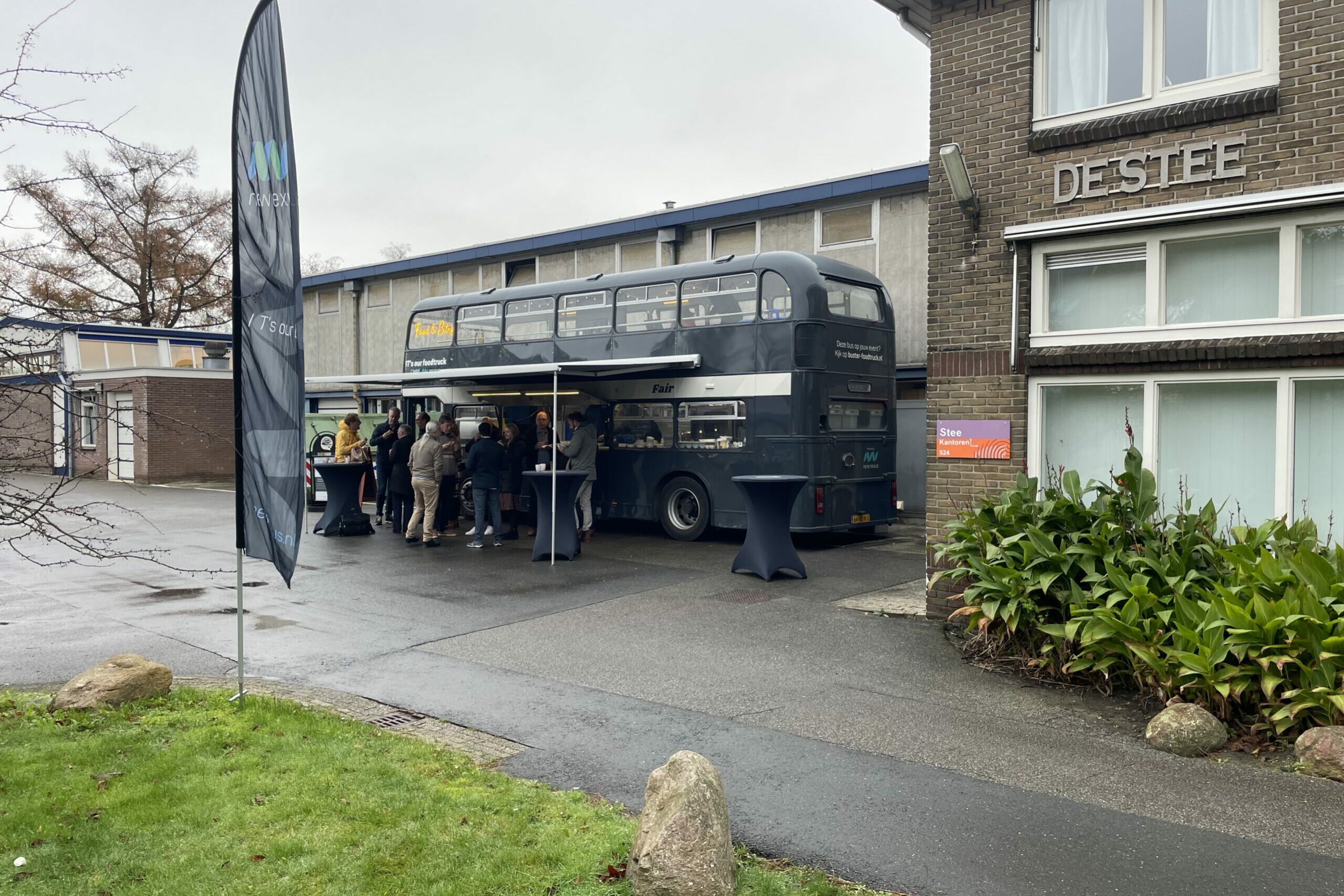 De ingebruikname van het nieuwe dataplatform werd gevierd in onze Engelse dubbeldekker met een demonstratie van de dashboards door het BI-team aan de kerngebruikers van Espria, iCare, Zorggroep Meander en Evean. Deze bus hebben we als New Nexus omgetoverd tot foodtruck en zetten we in op bijvoorbeeld festivals en zakelijke evenementen als leerwerkplek voor mensen met een afstand tot de arbeidsmarkt. De deelnemers worden daarbij begeleid door onze facilitair manager en kok Harrie de Vries die hier speciaal voor is opgeleid.