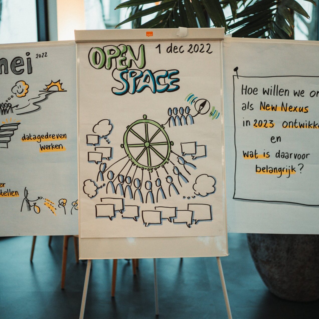 Bij New Nexus stuurt iedereen mee. Heb je een idee of een verbetervoorstel, dan kun je dat altijd kwijt. Of je gaat er met een collega gewoon meteen mee aan de slag. Maar twee keer per jaar pakken we het wat grootser aan. Dan organiseren we een ‘Open Space’ waar we met z’n allen in gesprek gaan over de koers van het bedrijf en de dagelijkse gang van zaken. Dat ziet er steeds weer anders uit en ook de collega’s die de bijeenkomst faciliteren variëren.