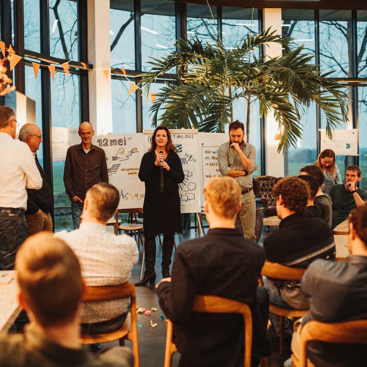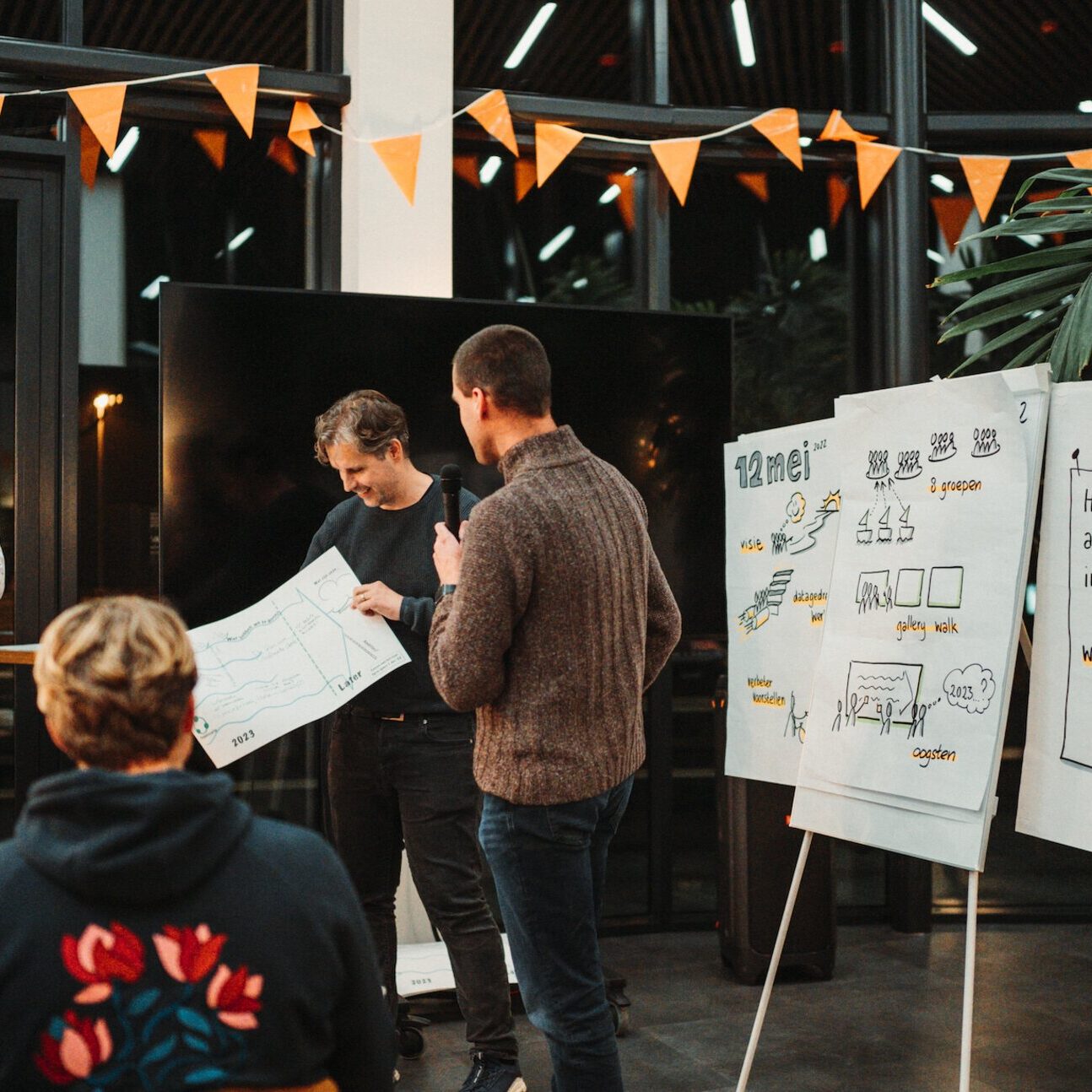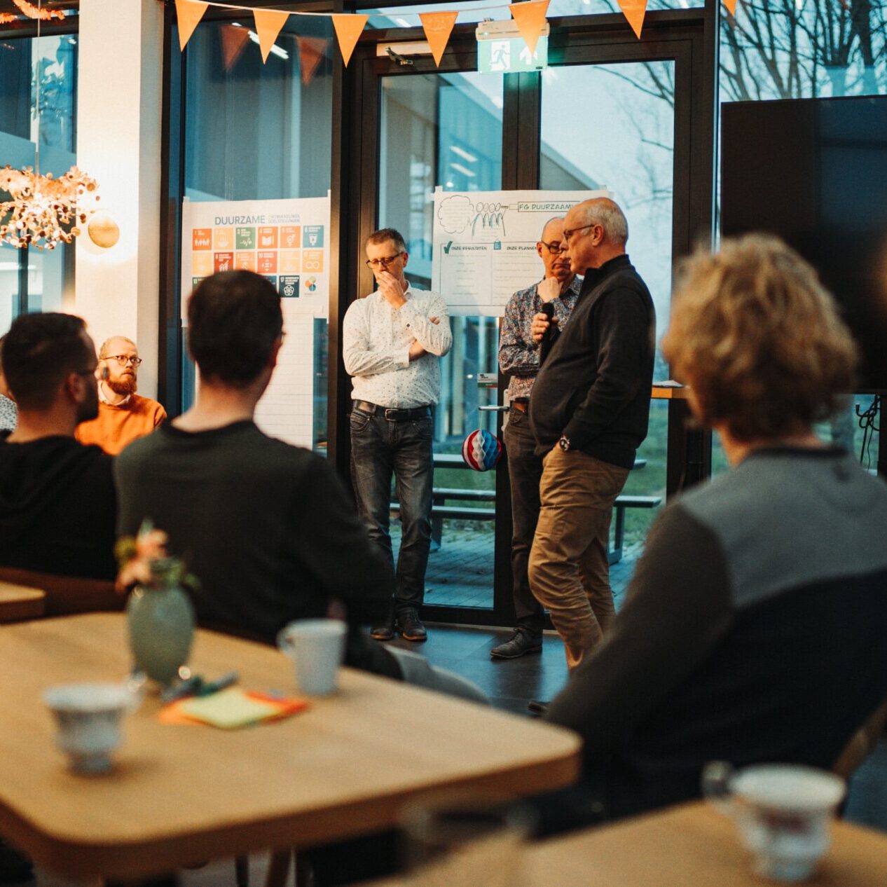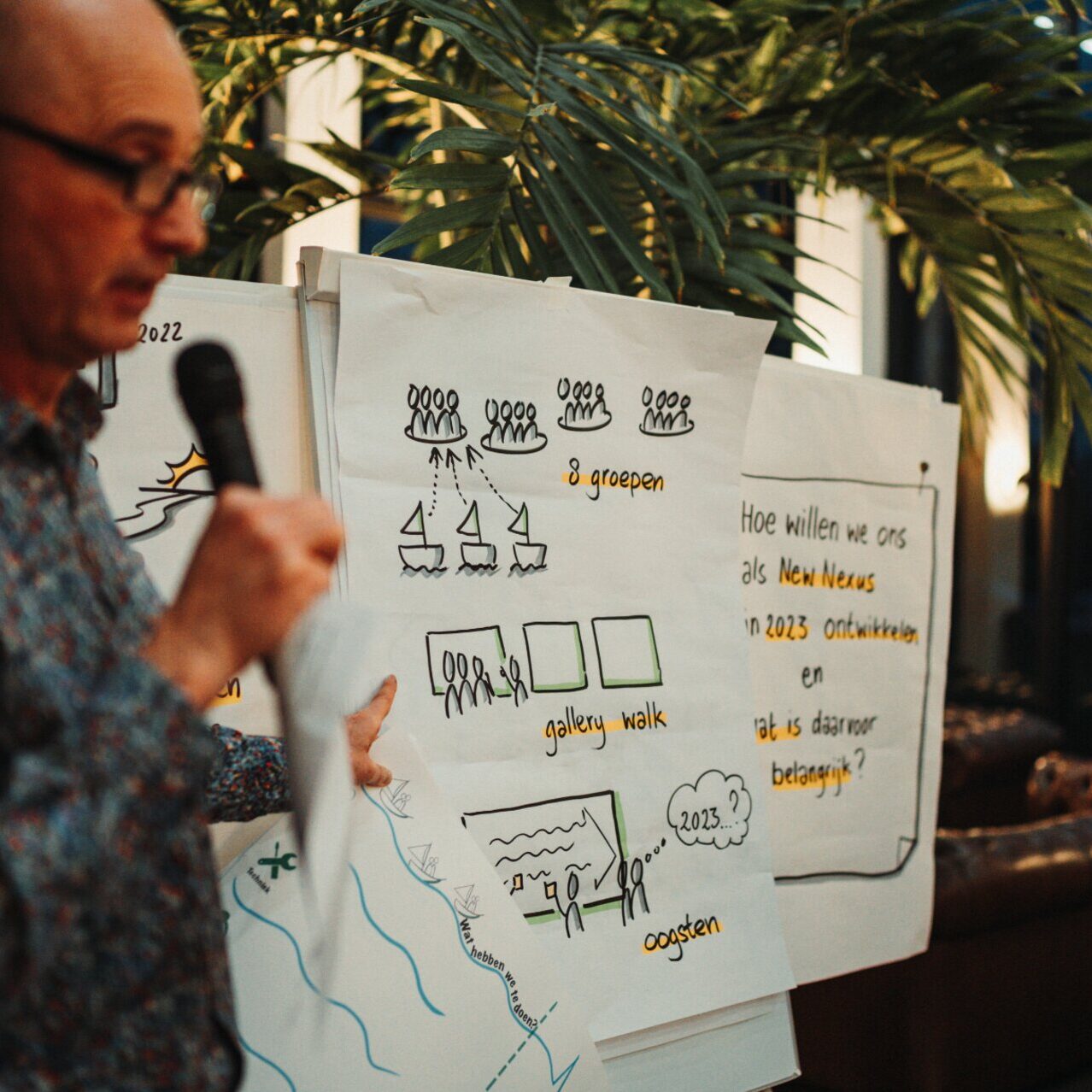 Deze keer kon iedereen zijn prangende vragen op een post-it naar het midden gooien, waarna een van onze stuurmannen of -vrouwen hem mocht beantwoorden. Vervolgens kon iedereen langs de vele posters met plannen en ideeën uit eerdere Open Spaces lopen, om daarna in groepen zelf een poster te maken met de prioriteiten voor 2023. Die werden dan weer aan de hele groep gepresenteerd. Samen nemen we verantwoordelijkheid voor de uitvoering.
